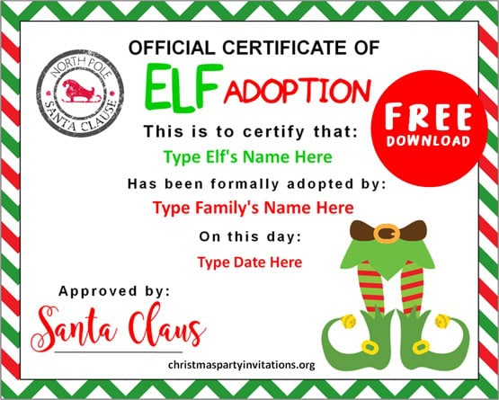 The good thing about Christmas is that they are celebrated every year, invite us to celebrate with our family and friends, at christmaspartyinvitations.org you can make free printable Editable Elf Adoption Certificate in adobe reader.
